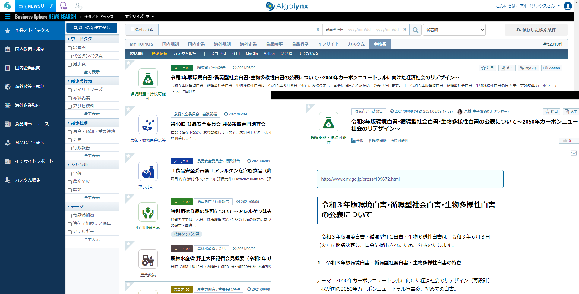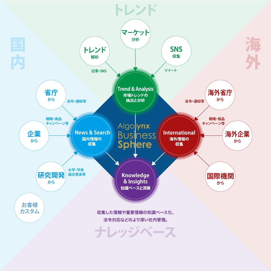Algolynx Business Sphere®では、国内外の規制・政策、市場・企業、研究、あるいは独自収集の情報など