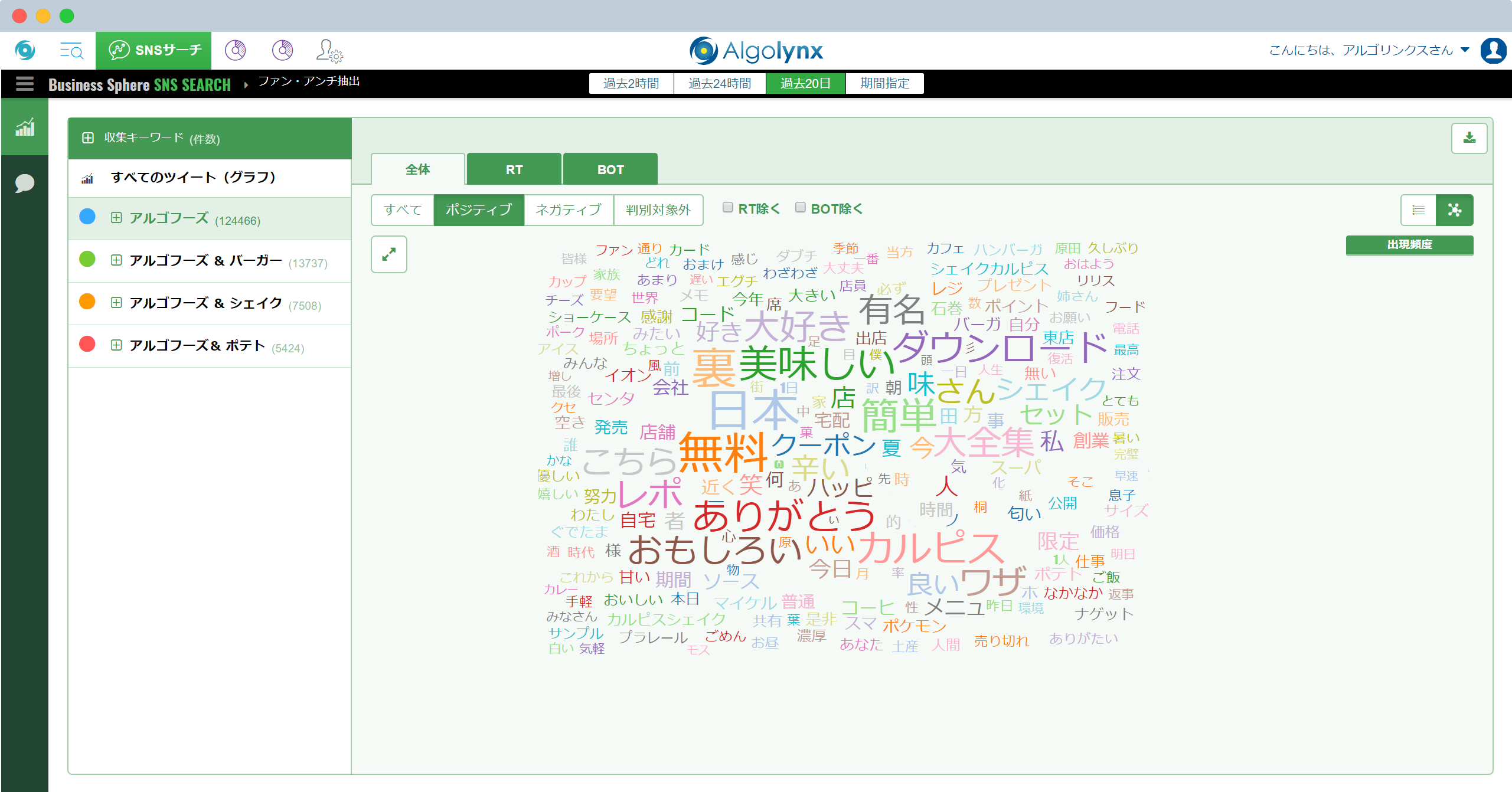 SNS投稿内容をリアルタイムにテキストマイニングし、頻発する単語、単語の相関性などをトレンドグラフでビジュアルに表示。グラフの気になる単語から詳細な投稿内容を参照することも可能。